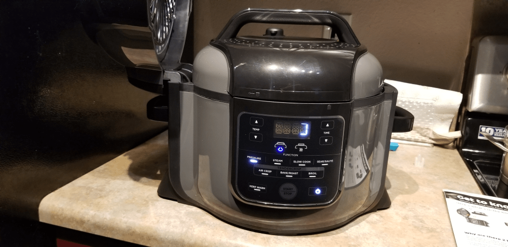 The Ninja Foodi comes as a 6.5 qt. and an 8 qt. Their tagline? “The Pressure Cooker That Crisps.” It is a multi-functioning gadget that allows people to create a whole meal in one pot. What is the Foodi able to do? It pressure cooks, air crisp, sear/sauté, bakes, broils, steams and slow cooks. If you get the 6.5 qt from some retailers it has a dehydrate function. We have a dehydrator so I did not see that as being a necessity. The 6.5 qt. will cook a 6-lb. roast or a 5-lb. chicken. Or if you are in need of 3-lbs of French fries, it will cook 3-lbs. of French fries. If you pressure cook a whole chicken and then air crisp it, you will never have to buy a rotisserie chicken again. That alone is exciting considering the last one I bought was not quite done and ended up being recooked once I cut into the chicken.