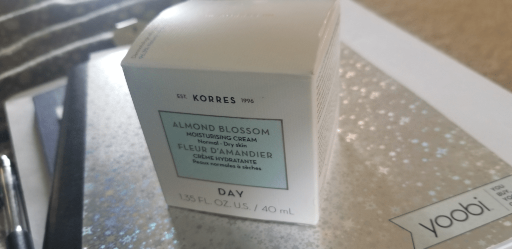 Korres creates really nice products. Their moisturizers tend to be thicker, which I love. Korres claims this moisturizer is for normal to dry skin. From the box, “Intense moisturising, fast-absorbing cream for long-lasting hydration, ideal for sensitive skin. With Almond Blossom extract, almond proteins and two types of hyaluronic acid, it offers valuable water-binding ingredients, reduces water loss and promotes skin elasticity.”