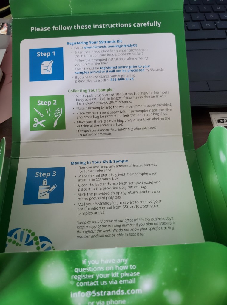 Then I found 5Strands. It was much easier than making another trip to the veterinarian’s office. I ordered it, they shipped the test, I brushed Finn and was able to get enough pieces of fur to place in the bag, which is not difficult for dogs with medium or long fur. It took a total of 10 days and I did not have to sit at the veterinarian’s office or waste time making and paying for 2 appointments plus the test. I’m not saying Finn is not worth doing all of that, but this pandemic makes life more difficult that it needs to be.